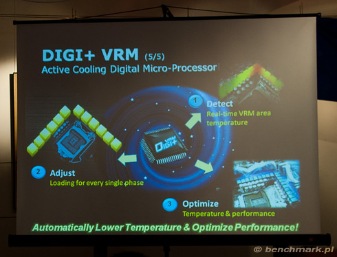 Dużo uwagi poświęcono najważniejszemu chyba elementowi DIP 2, jakim jest zastosowanie cyfrowej sekcji zasilania DIGI+ VRM zamiast dotychczasowych analogowych układów. Cyfrowe zasilanie, jak zapewnie wielu Czytelników wie, pozwoli dużo precyzyjniej kontrolować ustawienia napięć i częstotliwości taktowania dla procesora oraz innych komponentów na płycie głównej.