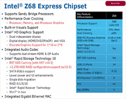 Chipset Intel Z68 będzie swojego rodzaju połączeniem funkcji oferowanych przez obecne już układy P67 i H67. Oznacza to więc, że możliwe będzie podkręcanie procesorów (tylko tych z serii K z odblokowanym mnożnikiem), pamięci oraz wykorzystanie i podkręcanie zintegrowanej w procesorze karty graficznej. Ukłonem w stronę osób dbających o środowisko jest technologia Virtu GPU, a więc przełączanie w mniej wymagającym środowisku graficznym między umieszczonym na tradycyjnej karcie graficznej układem graficznym, a tym zintegrowanym w procesorze.