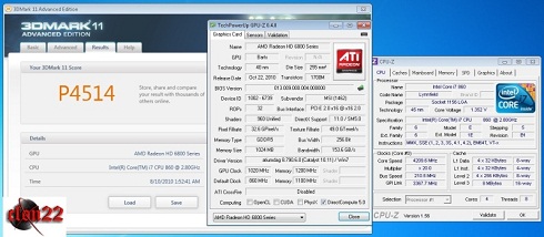 Powyższa informacja nie byłaby jednak warta uwagi gdyby nie sugerowana przez MSI spora podatność Radeon HD 6850 Cyclone Power Edition na podręcanie. Jeden z użytkowników portalu hardwarezone.com.sg udowodnił, że nie są to jedynie papierowe rozważania. Udało mu się uzyskać jeszcze wyższe, niż fabrycznie taktowania karty - 1020 MHz dla rdzenia i 1200 MHz (efektywnie 4800 MHz) dla pamięci. Poniżej screen z 3D Mark 11 potwierdzający osiągnięty wynik.