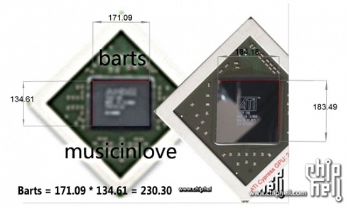 Wymiary Bartsa (zarówno w wersji PRO i XT) wynoszą mniej więcej 17,1 mm x 13,4 mm, a więc jego powierzchnia to 230 mm2. Dla porównania układ Cypress wykorzystany w Radeonach HD 5800 ma powierzchnię 334 mm2, Juniper – obecny w Radeonach HD 5700 – 160 mm2, natomiast GF104 od Nvidii (użyty w GeForce GTX 460) 367 mm2.