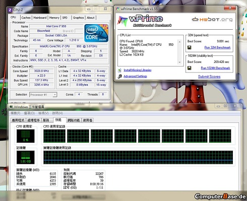Drugi test został wykonany w programie wPrime, który w odróżnieniu od poprzedniego wykorzystuje moc oferowaną przez wszystkie dostępne wątki. Próbka 32 MB została przetworzona w 8,735 sekundy, a 1024 MB w 255,631 sekundy. Dla porównania Intel Core-i7 950 do pierwszej próbki wymagał o 1,2 sekundy więcej czasu, a więc był o 13 procent mniej wydajny. Z drugą próbką poszło już lepiej, ale nadal o prawie 14 sekund dłużej - różnica 5 procent na korzyść układu Sandy Bridge.