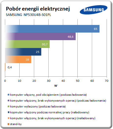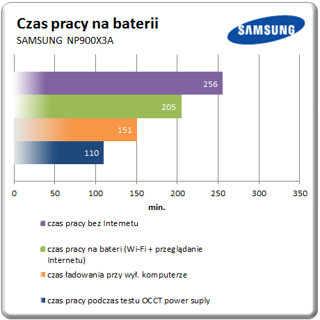 Komputer uzyskał krótszy czas pracy na baterii bez Internetu (wyłączone również Wi-Fi) od starszego modelu jakim jest NP900. Po za tym reszta czasów jest dłuższa, więc jest to duży plus dla tego urządzenia – gdyż cena tego modelu jest dużo niższa niż cena NP900.