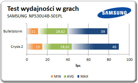 Następnie przystąpiłem do testów wydajności podczas grania. Ze względu, że przeznaczeniem głównym tego laptopa nie są gry, postanowiłem wybrać tylko dwie gry: Crysis 2 oraz Bulletstorm. Poniżej przedstawiam wykresy przedstawiające ilości klatek (minimalną/maksymalną/średnią uzyskanych przy standardowych ustawieniach gry. Test przy każdej grze trwał około 15 minut.