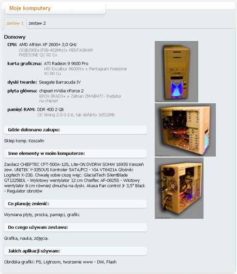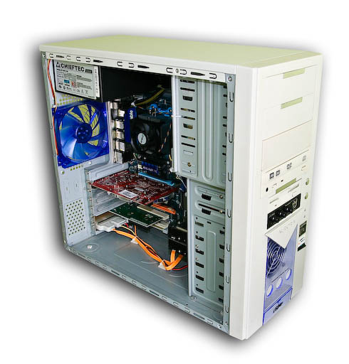Niestety przy tak ograniczonym budżecie nie byłbym w stanie wymienić wszystkich komponentów które się do tego nadają, albo musiałbym ograniczyć się do zakupu mniej wydajnych części. Jako, że głównie stawiam na obróbkę grafiki, zdjęć a w drugiej kolejności na rozrywkę, priorytetem jest moc obliczeniowa. Ostatecznie z oryginalnej konfiguracji pozostawiłem zasilacz Chieftec CFT-500A-12S, obudowę, nagrywarkę Lite-ON oraz wyciągnięty z zewnętrznej kieszeni dysk twardy WD Caviar SE 320 GB. Do wymiany poszedł procesor Athlon XP 2600+, karta graficzna Radeon 9600Pro, płyta główna EPOXa oraz pamięci DDR. Jednym słowem gruntowny remont. Trochę moją sytuację polepszała czekająca od dłuższego czasu w szufladzie karta graficzna MSI 9500 GT którą postanowiłem również wykorzystać.