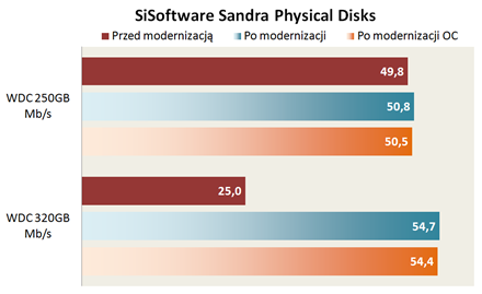 Dla porównania umieściłem również prędkości przesyłu danych przed modernizacją. W starej konfiguracji WDC 250 GB był podłączony za pomocą kontrolera SATA/PCI VIA VT6421A natomiast WDC 320 GB przy pomocy kieszeni zewnętrznej UNITEK Y-335OUS podłączonej przez USB.