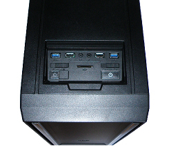 Panel I/O został wyposażony w cztery porty USB w tym dwa 3.0 - wewnętrzne. Standardowo umieszczono tu klawisze power i reset, złącza mikrofonu i słuchawek oraz rzadko spotykany czytnik na kart SD. Dodatkowo producent wyposażył panel I/O w kontroler obrotów, który znajduje się po lewej stronie, nad klawiszem reset. Pozwala on na regulację prędkości obrotowej trzech seryjnie montowanych wentylatorów w dwóch ustawieniach, LOW - 700 RPM i HIGH - 1200 RPM. Skrajnie po prawej stronie, nad klawiszem power umieszczono inny ciekawy element. Jest to przełącznik dysków twardych, pozwala on wybrać HDD, z którego ma się ładować system operacyjny.