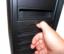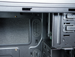 System montażu w zatokach 5.25" nie wyróżnia się niczym szczególnym. Wiele poprzednich konstrukcji CM było wyposażonych w podobne rozwiązanie, które całkiem nieźle się sprawdza. Wystarczy przesunąć niewielką rączkę, aby odblokować mocowanie, a następnie przestawić ją w poprzednią pozycję, aby zablokować. Napędy trzymają się dość mocno i stabilnie, aczkolwiek bez dokręcenia ich śrubkami występuje niewielka ruchomość, która skutkuje minimalnymi wibracjami przenoszonymi na resztę konstrukcji.