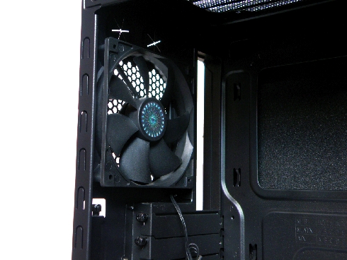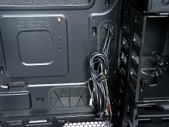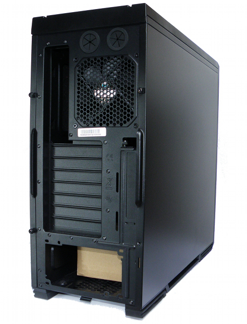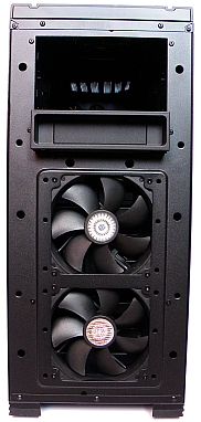 Tył obudowy prezentuje się bardzo standardowo. Na samej górze widać dwa spore przepusty dla węży chłodzenia wodnego, tuż pod nimi umieszczono 120 milimetrowy wentylator, zaś po lewej od niego znajduje się otwór panelu I/O płyty głównej. Poniżej umieszczono 8 śledzi kart rozszerzeń, z których jeden jest zorientowany pionowo, a jego przeznaczenie to np: kontroler wentylatorów, lub dodatkowe złącza USB/Fire-Wire. Na samym dole swoje miejsce ma zasilacz.