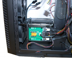 Silencio 650 została wyposażona w ciekawa funkcję. Na górnym panelu znajduje się przełącznik pozwalający uruchomić komputer z dwóch różnych dysków twardych. Zdjęcia przedstawiają specjalna płytkę drukowaną, która umożliwia ten zabieg.