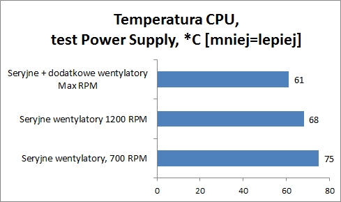 Na wykresie bardzo dobrze widać, że seryjne wentylatory słabo radzą sobie z wentylowaniem obudowy. Mimo, iż procesor nie jest podkręcony, a jego chłodzeniem zajmuje się wydajny cooler, temperatura CPU w stresie znacznie przekracza 70*C. Dopiero podniesienie prędkości obrotowej wentylatorów do 1200 RPM, obniża tą wartość poniżej 70*C.