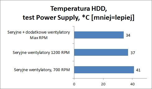 Dyski twarde są w tej komfortowej sytuacji, iż zostały umieszczone w bezpośredniej bliskości przednich wentylatorów, więc ich temperatura, zawsze powinna być akceptowalna. Nie zmienia to jednak faktu, że i tu widać spore zmiany w osiąganych temperaturach, gdy dołożone są dodatkowe wentylatory.