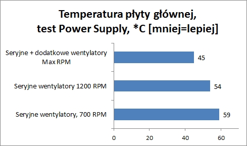Temperatura płyty głównej nie jest bardzo wysoka, ale wyraźnie widać, że aby zachować niskie temperatury konieczne jest doposażenie obudowy w dodatkowe wentylatory.
