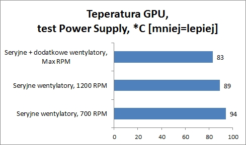 Sytuacja powtarza się. Przy najniższych obrotach seryjnych wentylatorów temperatury GPU niebezpiecznie zbliżają się do 100 stopni Celsjusza! Podniesienie ich obrotów nieznacznie oddala widmo spalenia karty graficznej, zaś wspomożenie wentylacji kolejnymi dwoma śmigłami obniża temperaturę do bezpiecznych, choć wciąż niemałych, 83*C.