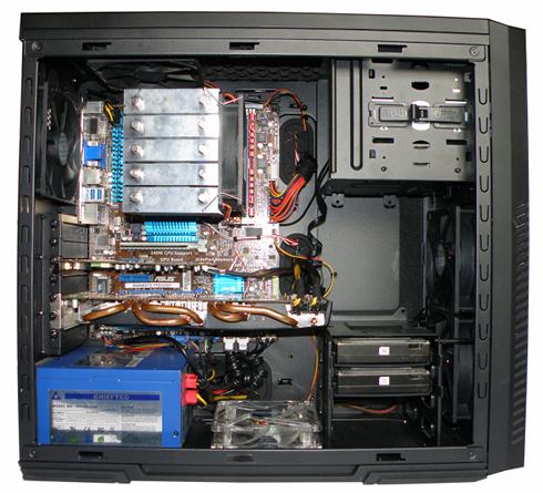 Natomiast biorąc pod uwagę fakt, że obudowa została wyposażona w bardzo ciche wentylatory i maty wygłuszające, powinno to zadowolić również miłośników ciszy. Założenie jest bardzo dobre i choć kultura pracy seryjnych wentylatorów jest nienaganna to maty niczego innego nie wygłuszają. Wyraźnie słychać kartę graficzną nawet z większej odległości. Radon HD 6870x2 nie należy do najcichszych, a dwa GPU to większe wyzwanie dla jej systemu chłodzącego, ale nie może być tak, że wygłuszona „skrzynka” jest tak samo głośna jak mój CM Centurion 590, który jest zupełnie pozbawiony wyciszenia, a w zasadzie przypomina „ser szwajcarski”!