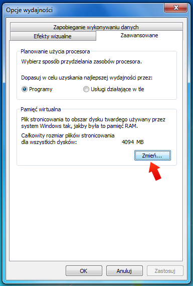 b) Otworzy się okno o nazwie „Opcje wydajności”, w którym przechodzimy do zakładki „Zaawansowane” i w tabeli „Pamięć wirtualna” klikamy na „Zmień...”.