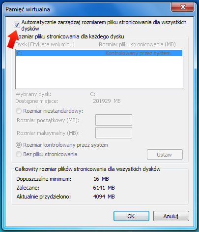 c) Wyświetla się okno „Pamięć wirtualna”, w którym dostrzec możemy, że domyślnie włączona jest opcja automatycznego zarządzania plikiem stronicowania - odznaczamy to pole.
