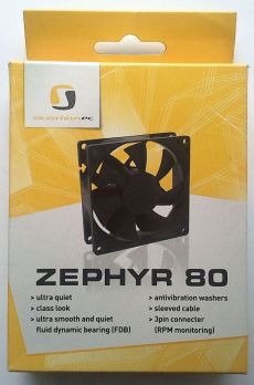Pierwszą z opisywanych konstrukcji jest 80 mm SilentiumPC Zephyr. Jest to coolerek znajdujący zastosowanie głównie w chłodzeniu obudów mających miejsce na urządzenie o takim rozmiarze. Ze względu na niewielki przepływ powietrza nie jest królem wydajności, ale w ciasnej, niewielkiej obudowie na pewno spełni swoje zadanie.