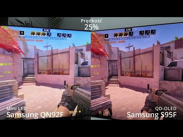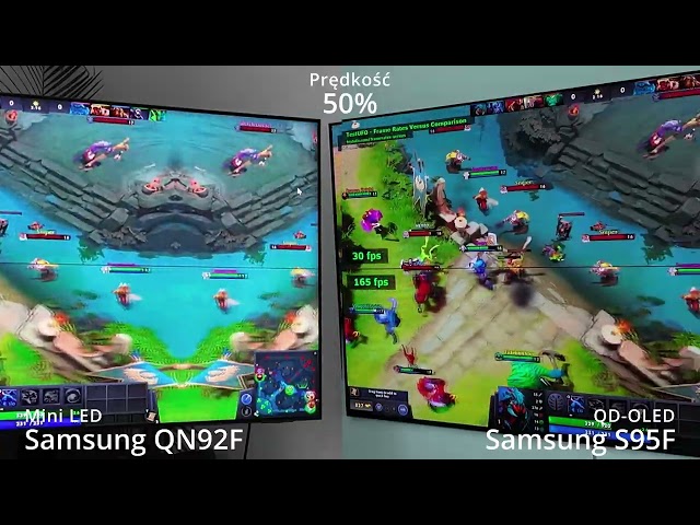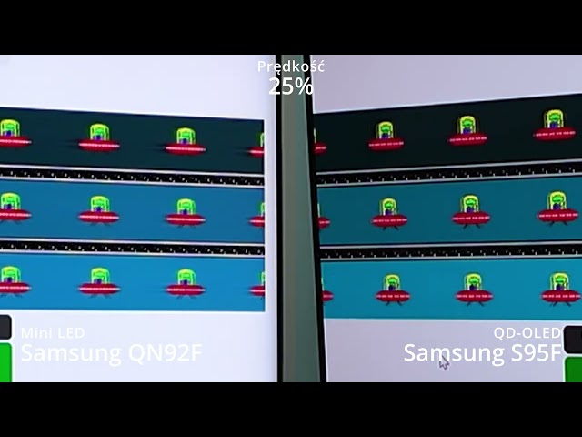 Zacznijmy od kwestii które są łatwo mierzalne, ale jednocześnie praktycznie nigdy nie trafiają na kartę produktu lub do tabeli ze specyfikacją telewizorów. Mowa o kwestii szybkości matrycy, która tylko częściowo słusznie kojarzy się z częstotliwością odświeżania, ale w głównej mierze wynika z czasu reakcji pikseli. Tutaj bezsprzecznie wygrywa panel OLED, oferując natychmiastowy czas reakcji - piksele potrafią momentalnie zmienić swój stan z jednego w dowolny inny, co dla naszego oka oznacza brak efektu rozmycia obrazu w ruchu. Panel LCD potrzebuje czasu i to w zależności od typu zmiany będzie to inny czas, zatem brakuje też stabilności. Problem ten pogłębia się, jeżeli telewizor mini LED korzysta z panelu typu VA - ten zdecydowanie poprawia kontrast, ale wydłuża jeszcze bardziej niektóre z transformacji pikseli. Na tym polu nowe telewizory, w tym omawiany Samsung QN92F oferują już parametry zbliżone do monitorów LCD dla graczy, ale nie zmienia to faktu, że w starciu z OLED nie mają szans.