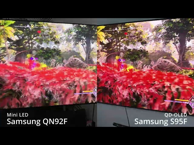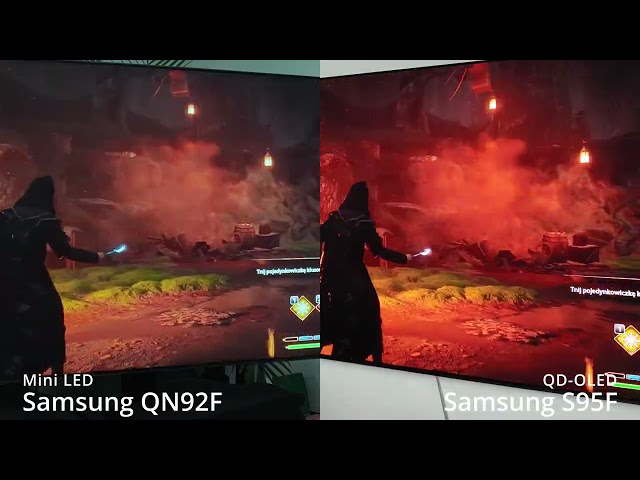 Jednocześnie są to też telewizory od producenta, który obecnie w mojej opinii oferuje najwięcej właśnie dla graczy pod względem funkcjonalności oraz technicznych możliwości, ale to już mogliście wyczytać lub usłyszeć z moich wcześniejszych recenzji. Przy okazji oba są też wyposażone w matową powłokę ekranu, co w moim odczuciu jest kluczowe dla graczy (nie bez powodu monitory są praktycznie zawsze matowe). Do reprezentowania paneli OLED wytypowałem Samsung OLED 65S95F - zatem telewizor wyposażony w tegoroczny panel QD-OLED, zdolny wyświetlać 4K z HDR przy adaptacyjnym odświeżaniu do 165 Hz. Natomiast do reprezentowania technologii mini LED wybrałem również tegoroczny model Samsung Neo QLED 65QN92F - tutaj również dostajemy 4K z HDR i adaptacyjnym odświeżaniem do 165 Hz.