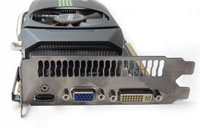 Śledź karty ASUS GeForce GTX 450 TOP został wyposażony w wyjścia: DVI, D-Sub i HDMI. Na górnej krawędzi PCB umieszczono złącze SLI służące do łączenia akceleratorów w pary. Natomiast na końcu karty znalazła się wtyczka 6-pin, przez którą dostarczamy dodatkowe zasilanie.